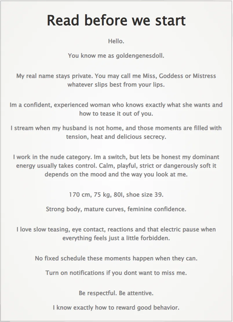 Camel Toe, Mistress, Nylon, Twerk, Spanking, Role Play, Dirty Talk, Handjob, Flashing, Yoga, Heels, Massage, Fingering, Tittyfuck, Cock Rating, Humiliation, Erotic Dance, Striptease, Sex Toys, Doggy Style, Cowgirl, Masturbation, Jerk-off Instruction, Hardcore, Blowjob, Topless, Foot Fetish, Footjob, Orgasm